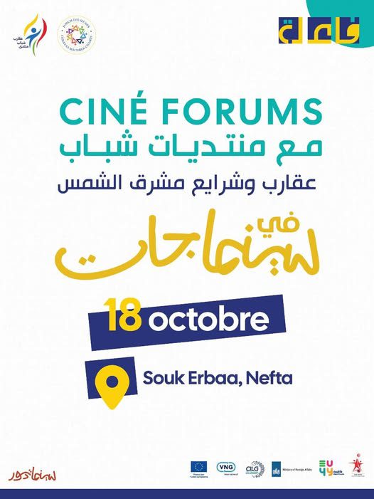 Join us on 18 October, from 9 a.m. to 11 a.m., for a Ciné-Forum session led by young participants — featuring film screenings, debates, and discussions on cinema, the environment, and Tunisian youth.