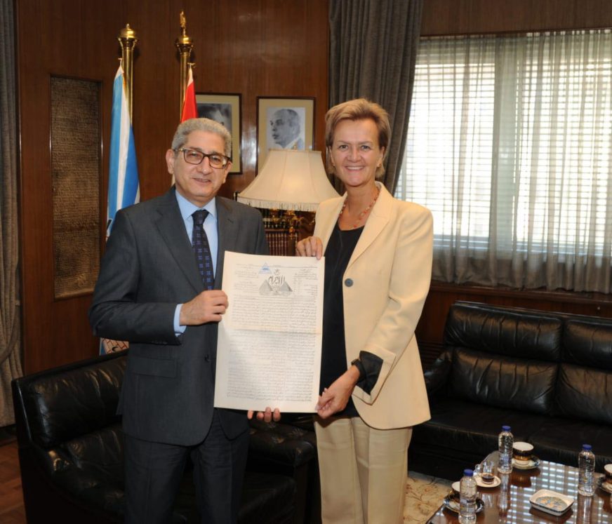 Le 1er octobre, l’ambassadrice de l’Union européenne en Égypte, Angelina Eichhorst, s’est rendue au siège historique du journal Al-Ahram, au centre-ville du Caire, pour participer aux célébrations du 150e anniversaire du quotidien. Lors de sa visite, l’ambassadrice Eichhorst a rencontré M. Maguid Mounir, rédacteur en chef d’Al-Ahram, qui lui a remis un cadeau symbolique : un exemplaire de la toute première édition du journal. Elle a souligné l’impact durable du journal et a rendu hommage aux journalistes qui continuent de perpétuer cet héritage. Cet anniversaire célèbre non seulement l’héritage de l’un des journaux les plus importants du monde arabe, mais réaffirme également le rôle essentiel des médias libres et indépendants dans la promotion du dialogue, de la compréhension mutuelle et du développement démocratique.