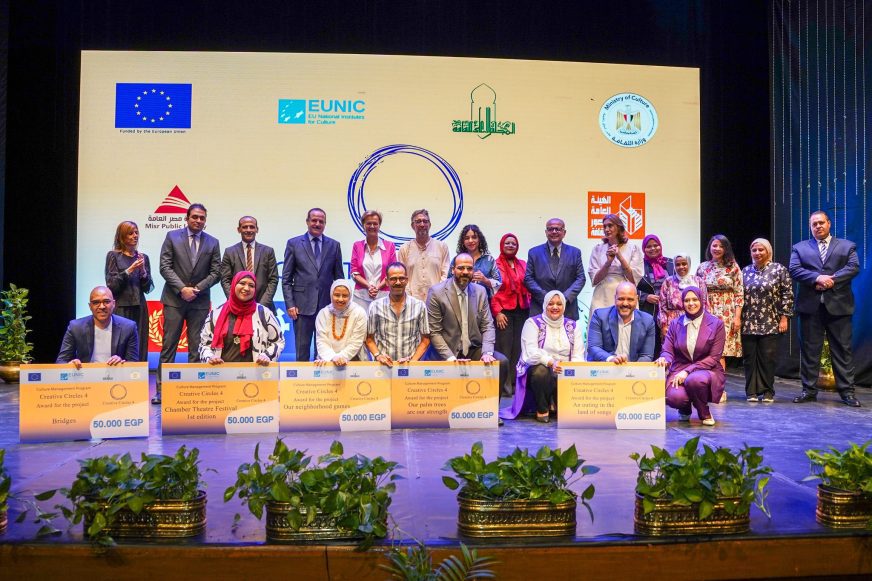 The fourth edition of “Creative Circles” provided training to cultural managers in the governorates of Assiut and Sohag. Yesterday, the winning teams of 5 projects as well as the trainers and experts were applauded in an event under the patronage of Professor Dr. Ahmed Heno, Minister of Culture, and in the presence of Ambassador Angelina Eichhorst, Head of the European Union Delegation to Egypt, Professor Dr. Ashraf El-Azzazy, Secretary-General of the Supreme Council of Culture, Professor Miguel Grajales, Director of Cultural Programs at the Spanish Cultural Institute, members of EUNIC and Professor Dr. Hesham Azmy, former Secretary-General of the Supreme Council of Culture and Head of the Egyptian Authority for Intellectual Property. Creative Circles is a training programme, funded by the European Union, organised in partnership between the European Union National Institutes for Culture (EUNIC) and the Supreme Council of Culture – Ministry of Culture, Egypt. Cultural managers experience increasing opportunities and creative industries are being promoted across all governorates in Egypt.