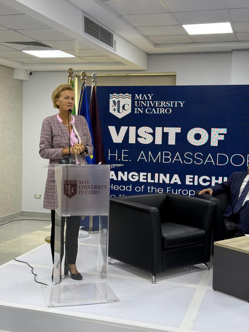 On 17 November, Ambassador of the European Union to Egypt, H.E. Angelina Eichhorst, visited May University in Cairo (MUC) to engage with students, faculty and partners on strengthening EU–Egypt cooperation in higher education, research and innovation. During the visit, Ambassador Eichhorst held a high-level dialogue with the university leadership on opportunities offered through Horizon Europe, the PRIMA Programme, and Erasmus+, highlighting the importance of international partnerships in advancing scientific excellence and educational mobility.