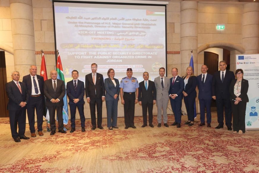 On 28 October, the European Union and Jordan, together with Germany, Spain and Sweden, officially launched a new Twinning Project aimed at strengthening the capacity of Jordan’s Public Security Directorate (PSD) to combat transnational organised crime. The initiative seeks to enhance resilience, improve cross-border cooperation, and align national practices with international standards in the field of law enforcement. It also reinforces Jordan’s institutional and operational capacities to address emerging security challenges through knowledge exchange and partnership with EU Member States. During the launch, the European Union reaffirmed its strong commitment to Jordan’s security sector, highlighting ongoing cooperation on multiple fronts, including the empowerment of female officers, rehabilitation and reintegration initiatives, and the modernisation of operational and technological systems within the PSD. This new Twinning Project marks another milestone in the EU–Jordan partnership, reflecting shared priorities to promote stability, security, and the rule of law in the region.