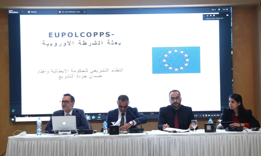 The event, co-organized by EUPOL COPPS and the Diwan, aimed to present and discuss comparative experiences from Jordan, Oman, and Italy, drawing lessons from both regional and EU best practices. These models are intended to serve as references for developing an effective framework for legislative quality in Palestine. In her opening speech, EUPOL COPPS Head of Mission, Karin Limdal, said that the Mission stands ready to support further improvements in the law-making process, enhance the quality of legislation, and ensure greater transparency, accessibility, and consistency in the legal framework.