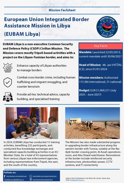 EUBAM Libya is a non-executive Common Security and Defence Policy (CSDP) Civilian Mission. The Mission covers mostly Tripoli-based activities with a project on the Libyan-Tunisian border, and aims to: Enhance capacity of Libyan authorities to manage borders, Combat cross-border crime, including human trafficking and migrant smuggling, and counter terrorism, Provide ad-hoc technical advice, capacity building, and specialised training.