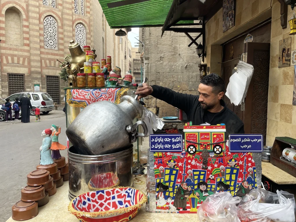 The procession begins at the castle, led by men carrying torches and sticks, performing rhythmic movements. Among them, musicians add to the spectacle, some astride camels, others on donkeys, beating drums or playing wind instruments. Together, they make their way through Cairo’s narrow streets, proclaiming to the people the arrival of the crescent moon and the first night of Ramadan. A few centuries later, in the same place known as Bab al-Wazir, a loud voice echoes from the television: “Tomorrow is the first day of Ramadan.” Muhammad Ali decorates his restaurant, serving foul and taamia, and sets up tables in front of the Um Sultan Shaaban Mosque and school, where the procession passes that day. He prepares for his first Suhoor and the start of his busiest, most cherished season. Unlike other restaurants in the area, his stands out. Nestled along the Darb al-Ahmar tourist trail, it sits at the crossroads of historic landmarks and traditional craft markets. The Darb al-Ahmar project, an initiative of the Aga Khan Foundation and the Ministry of Tourism and Antiquities, with funding from the European Union, has focused on restoring its mosques and revitalizing its shops. For an approximate distance of 2 kilometers, the trail draws visitors to other worlds, featuring these days, in every corner, rituals of Ramadan as they were centuries ago.